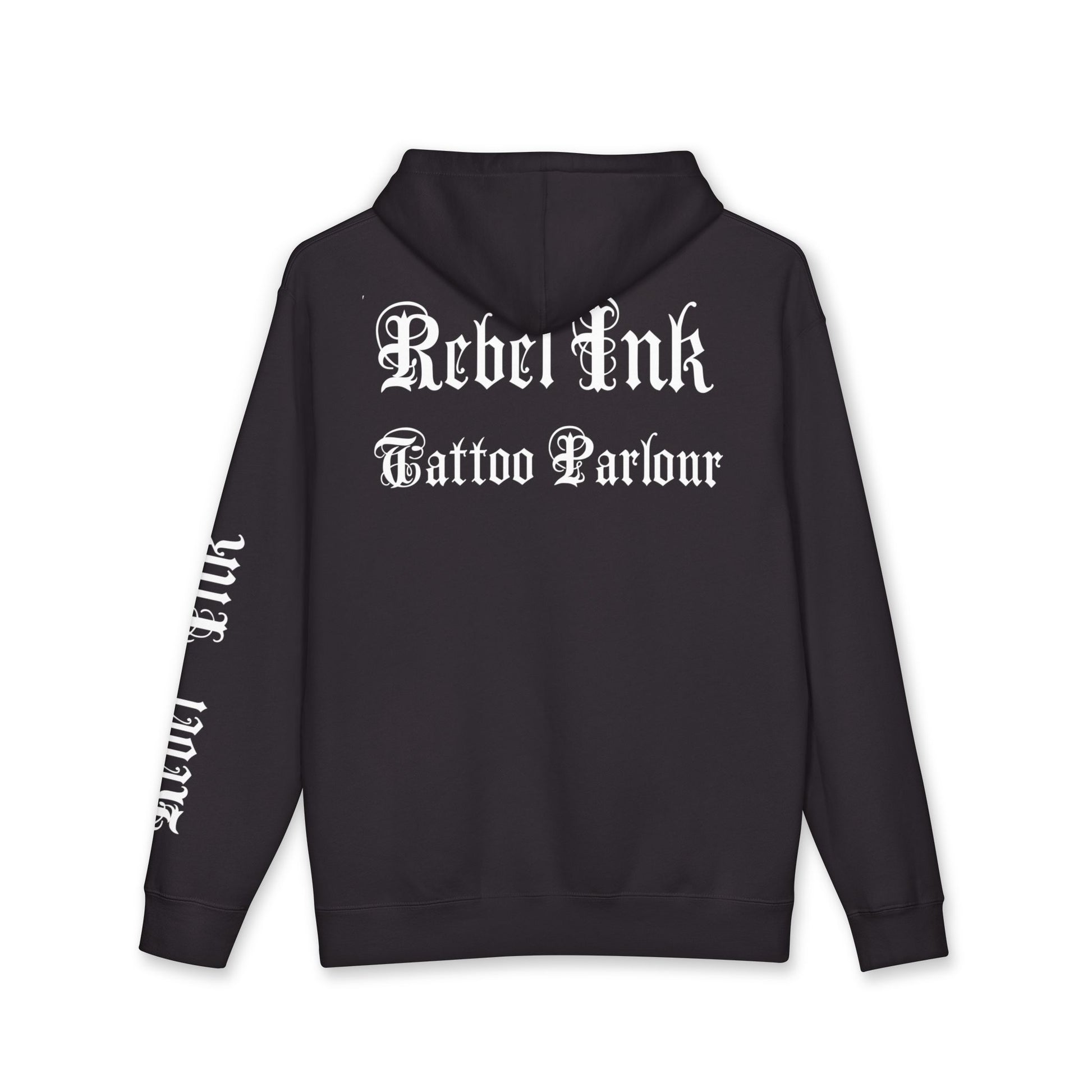 This heavyweight hooded sweatshirt carries attitude and comfort in equal measure. The front bears a distressed “REBEL INK” emblem with crossed tattoo machines and an established-date detail, while the back features bold, hand-lettered text that reads “Tatted & TIRED but still fucking magic” framed by subtle stars and crescent accents. Long sleeves are printed with “REBEL INK” down the arms for a streetwise, tattoo-studio vibe. Inside, a fleece-lined hood and dense 10 oz fabric wrap you in warmth; roomy cut and ribbed cuffs make it easy to layer over tees after long shifts at the shop or late-night studio sessions. This sweatshirt feels lived-in from the first wear — gritty, honest, and a little defiant — made for people who show their story on skin and keep making art even when they’re running on fumes.