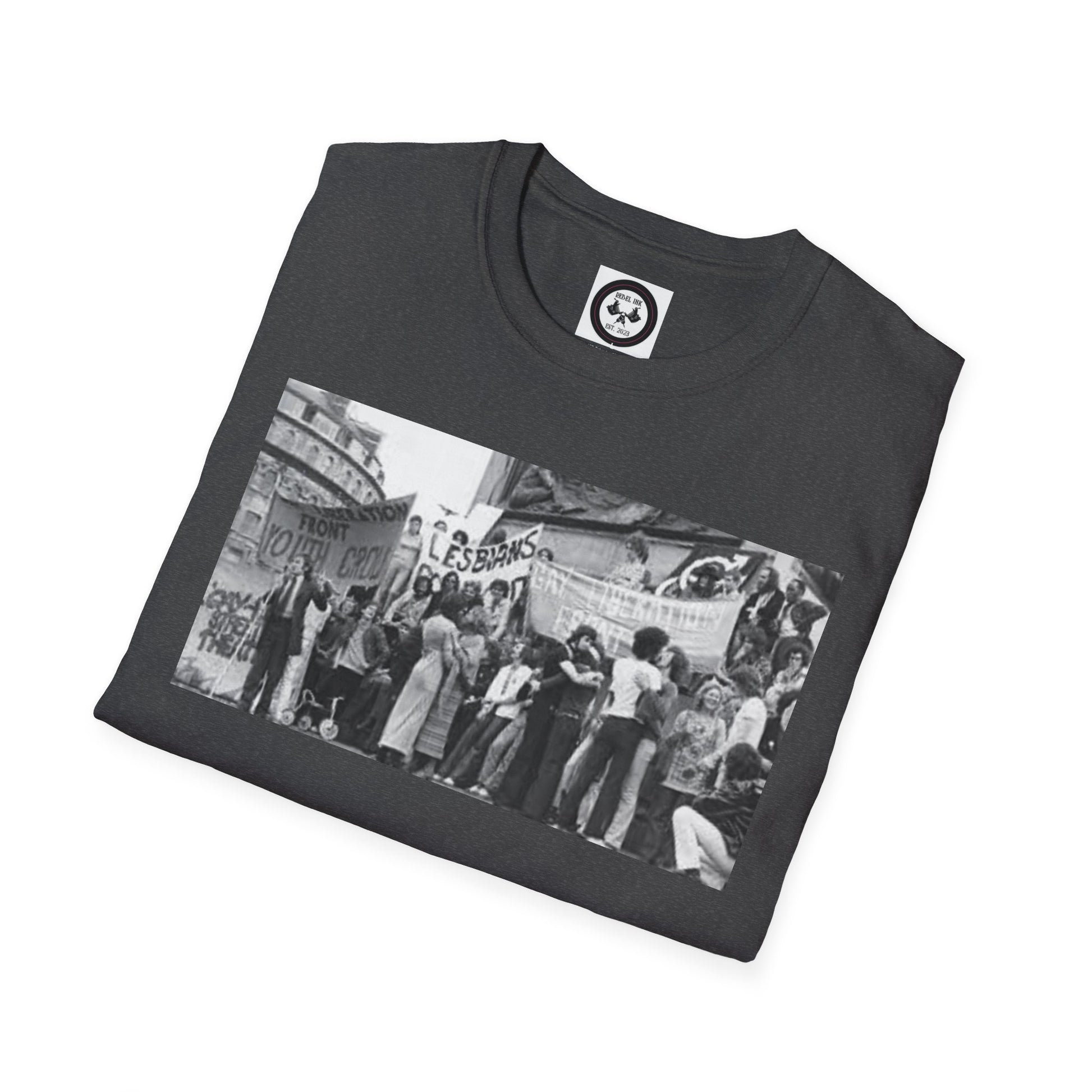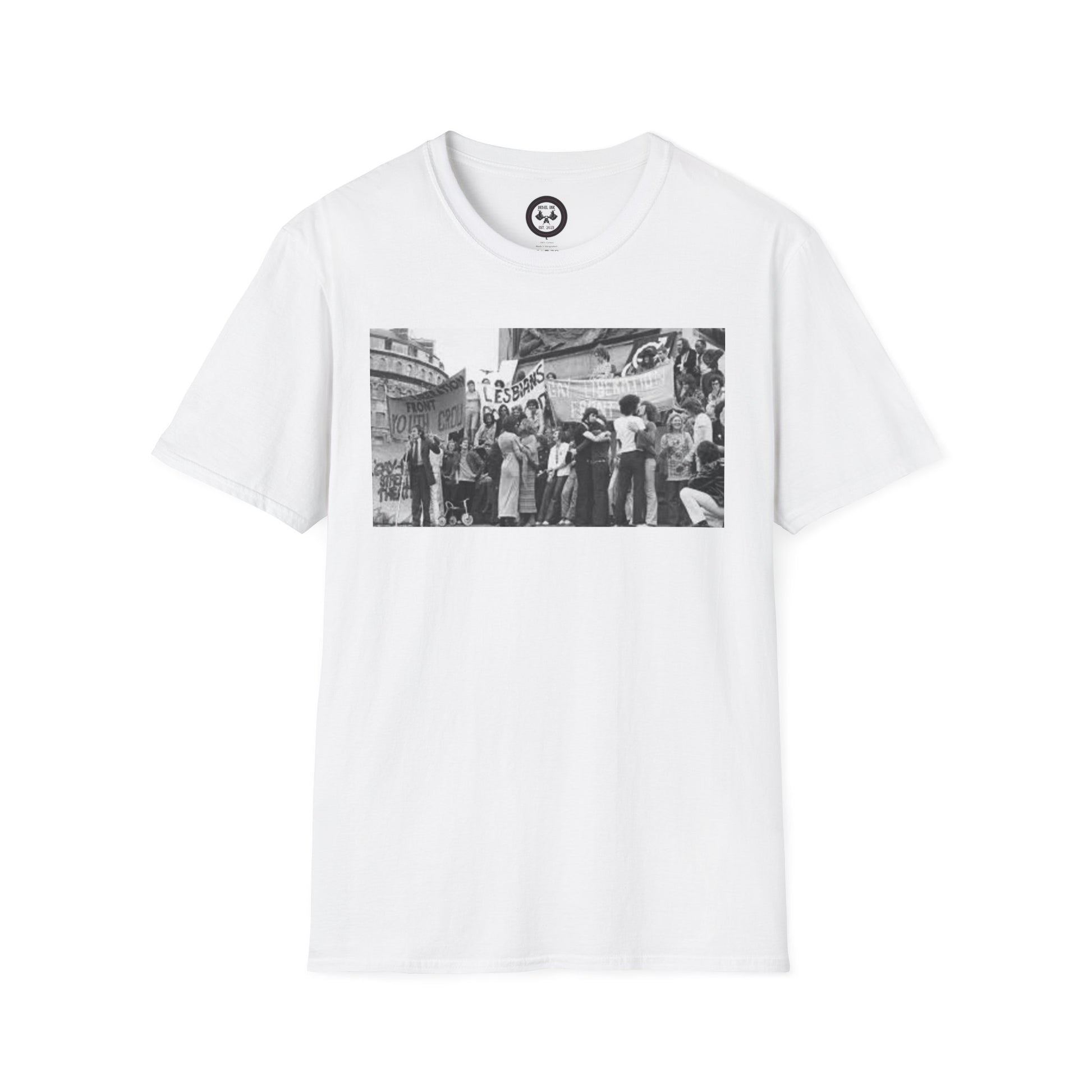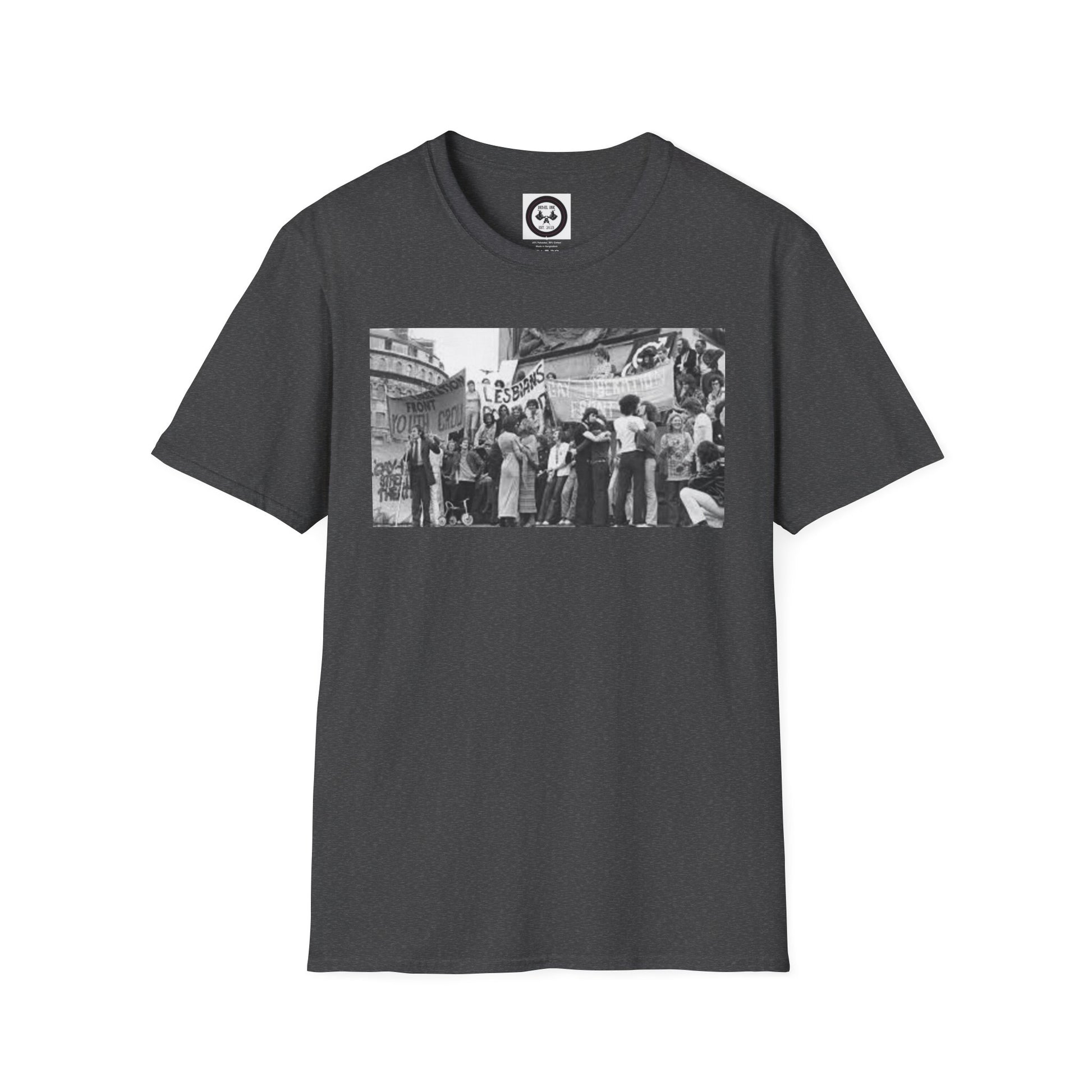 A unisex t-shirt featuring a design inspired by the stonewall riot. Made with 100% ring-spun cotton, this lightweight fabric offers a comfortable fit all year round. The classic crew neckline and versatile style make it suitable for any occasion, be it formal or semi-formal. Perfect for adults looking to make a statement and show support.