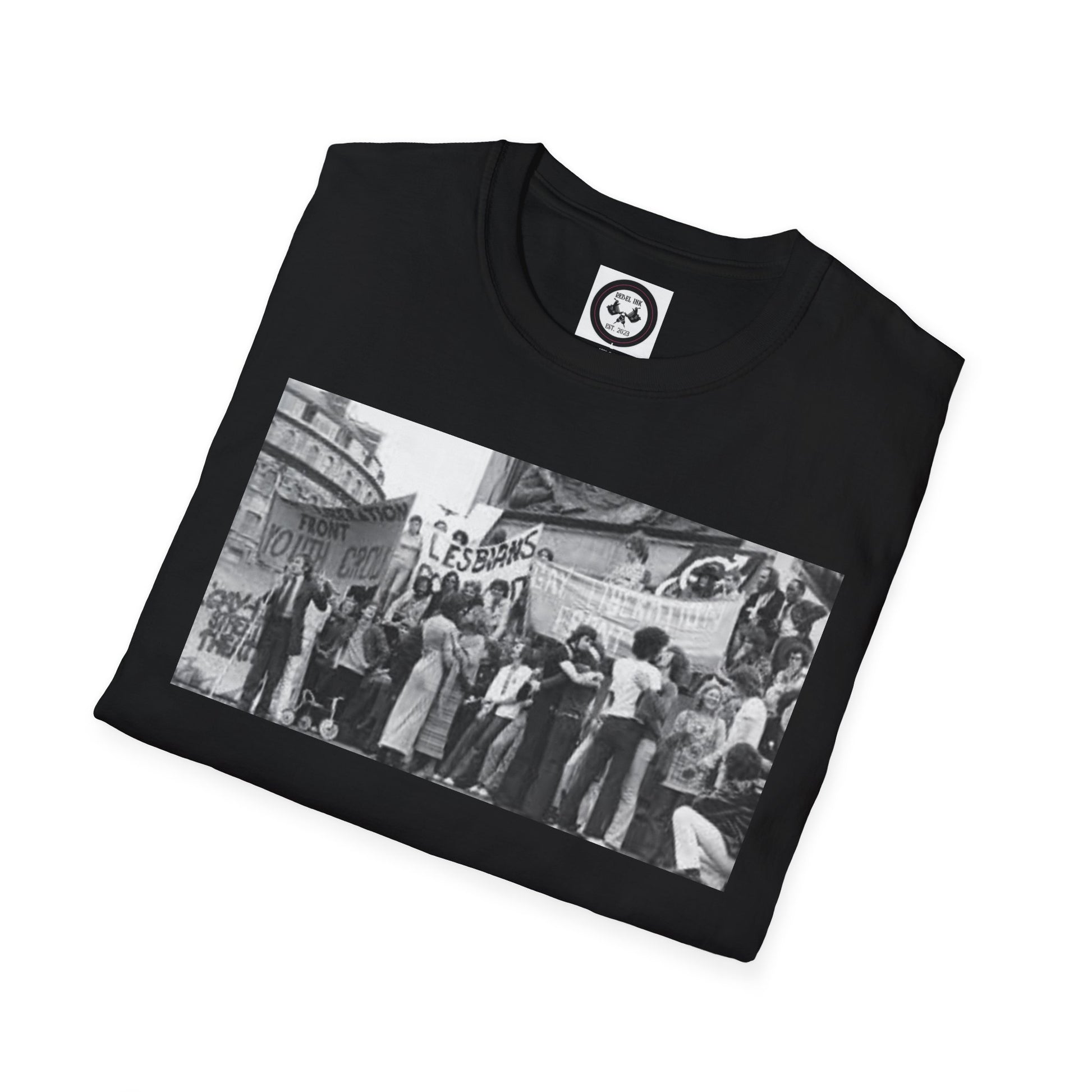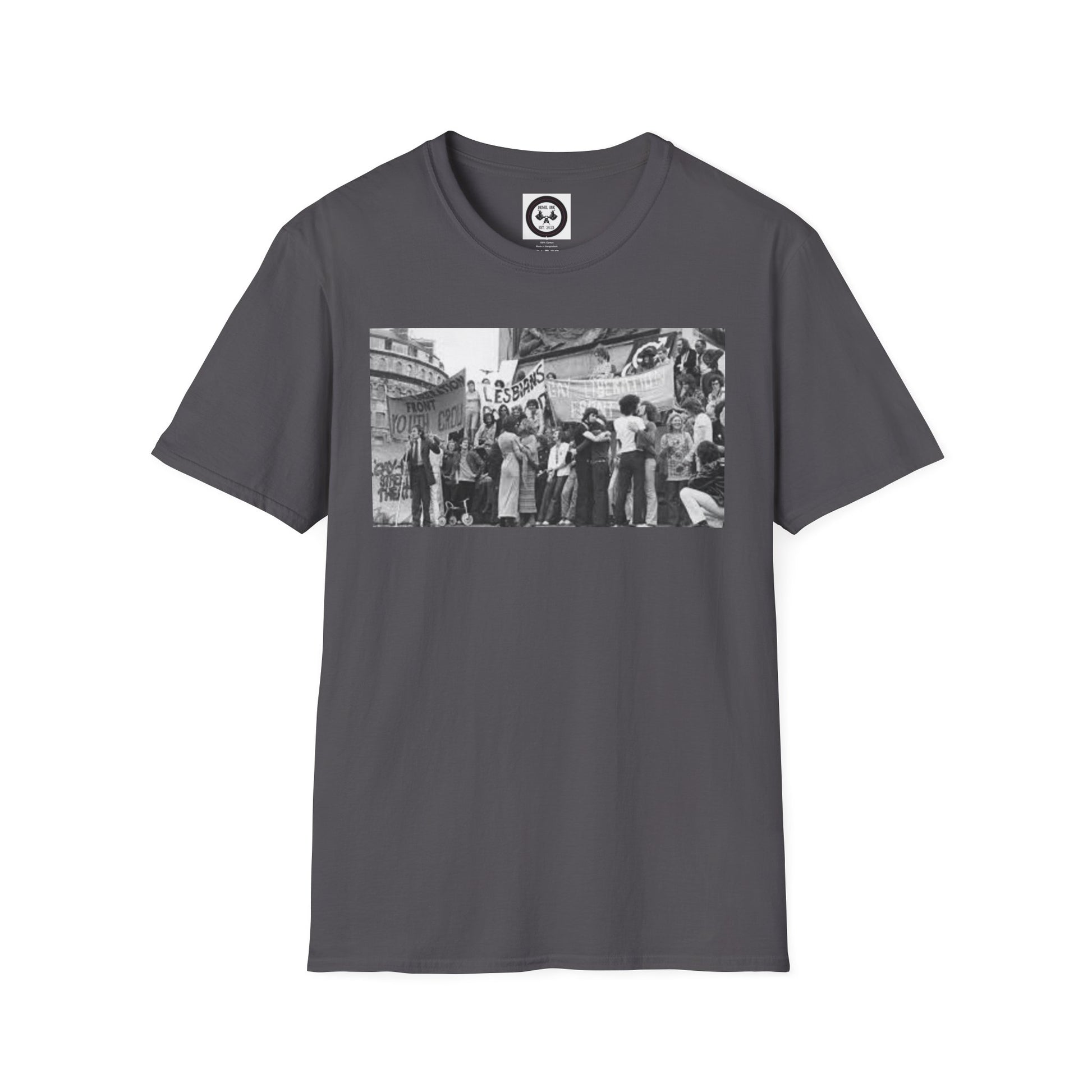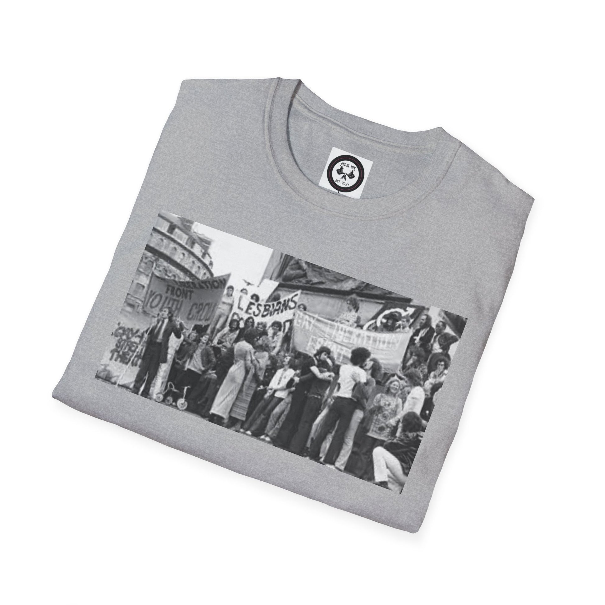 A unisex t-shirt featuring a design inspired by the stonewall riot. Made with 100% ring-spun cotton, this lightweight fabric offers a comfortable fit all year round. The classic crew neckline and versatile style make it suitable for any occasion, be it formal or semi-formal. Perfect for adults looking to make a statement and show support.