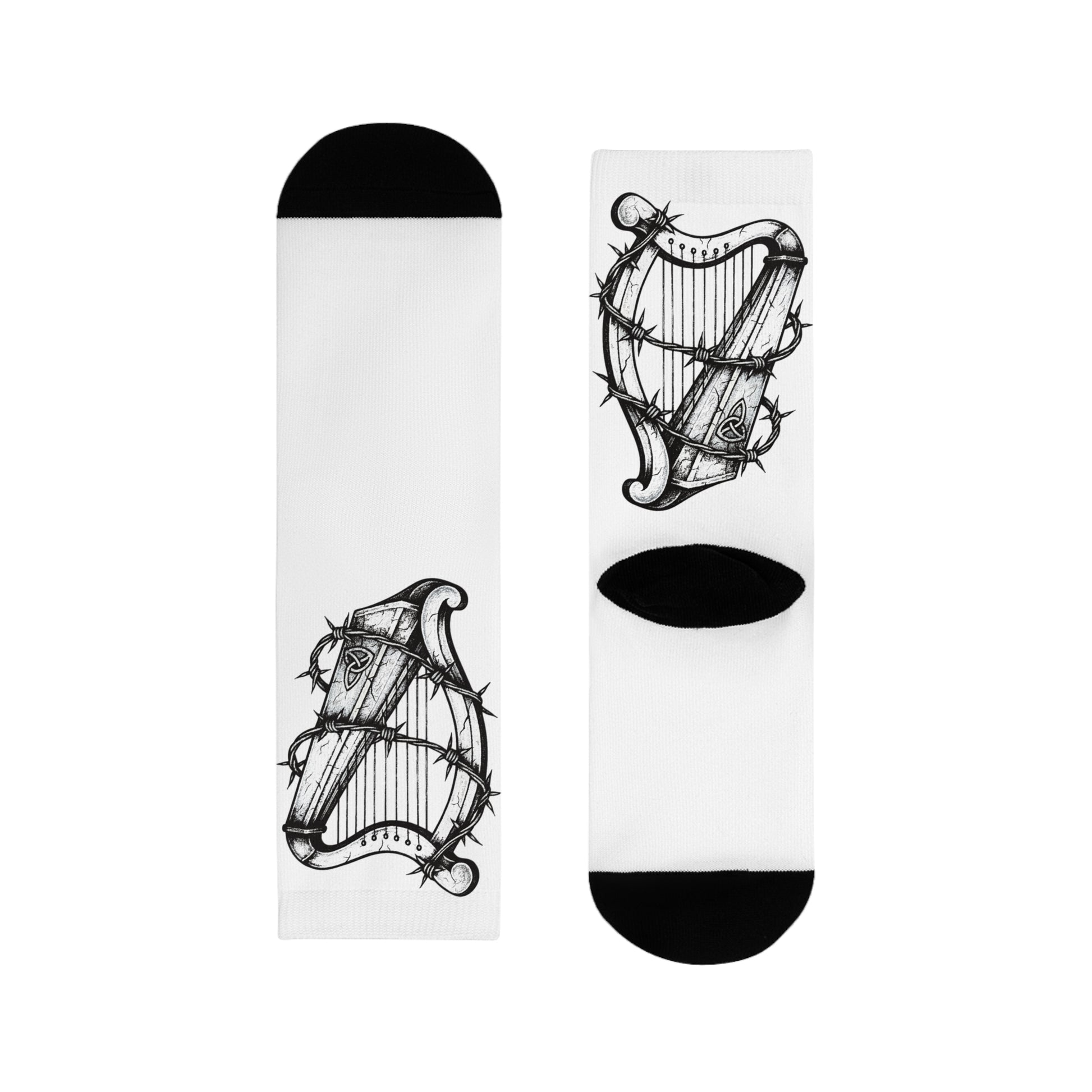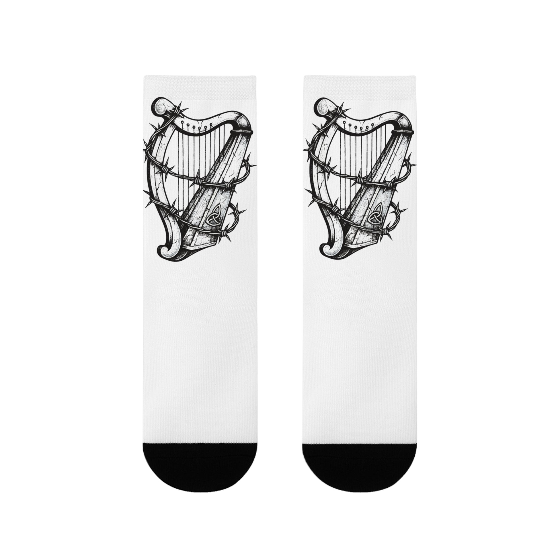 Cool rebellious socks featuring a harp wrapped in barb wire design. These crew socks are perfect for those who want to showcase their unique style and make a statement. Ideal for individuals who enjoy edgy and alternative fashion. Perfect for wearing during music festivals, concerts, or simply to add a hint of rebellion to your everyday outfit.